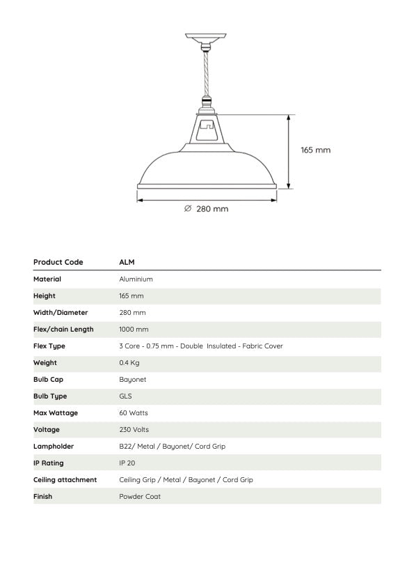 Included: Lampshade, cable, B22 fixture & ceiling cap/cup.